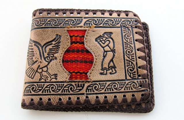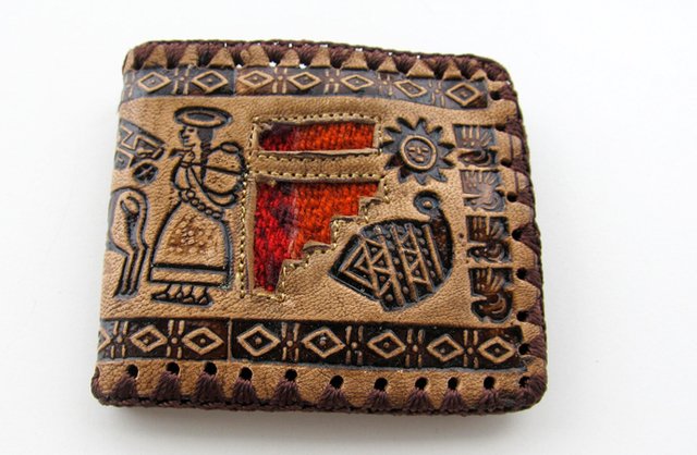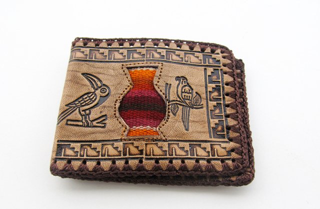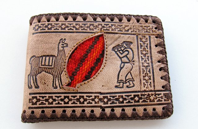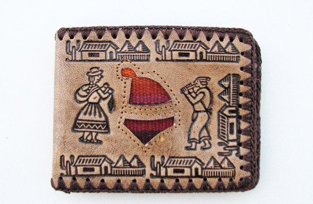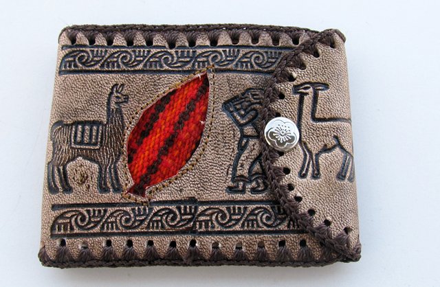Billetera de cuero para hombre con imágenes andinas y apliques awayo antiguo de 11x9cm. Compartimentos para tarjetas y monedas.